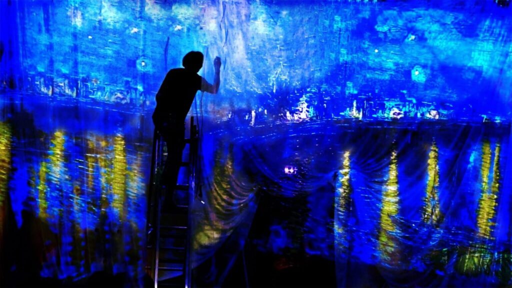 Many dancers take a break here, some lie down on the boards and let the scenery sink in. The architecture enhances the effect: the projections unfold in the depth and height of the room, refracting off the movement of the bodies and blurring the boundaries between real and projected.